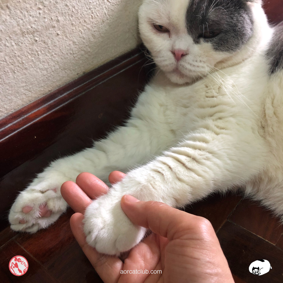 อันนี้ต้องบอกก่อนว่า การจะขอแมวจับมือได้นั้น ต้องเป็นแมวที่สนิทกันจริงๆ เพราะโดยปกติแมวจะไม่ให้จับมือง่ายๆ แมวจะหุบมือหนี หรือไม่ก็กางเล็บออกมาแทน แต่ถ้ารู้ใจกันแล้วแมวจะยอมให้จับมือได้ทั้งข้างซ้ายและขวา ซึ่งจะให้ความรู้สึกพิเศษมาก เพราะบอกถึงความไว้วางใจ บอกถึงการยอมรับว่าเป็นเพื่อน ซึ่งแมวไม่ได้มีให้กับทุกคน การได้จับมือกลมๆ นุ่มๆ ของแมว จึงเป็นความรู้สึกพิเศษที่แมวแสดงออก เป็นความรู้สึกดีจริงๆ